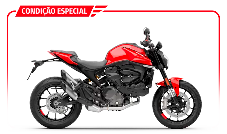 R$ 86.990,00Monster. Condições Especiais. Ofertas válidas nas Concessionárias Ducati Autorizadas para motocicletas básicas zero-quilômetro. Preços, ofertas e condições de financiamento válidos até 31/12/2025 ou enquanto durarem os estoques. Consulte a disponibilidade na concessionária da sua região.