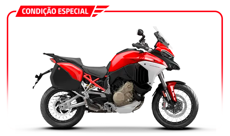 Supervalorização da sua seminovaMultistrada V4 S (Red e Aviator Grey). Opção de financiamento com taxa 0%. Ofertas válidas nas Concessionárias Ducati Autorizadas para motocicletas básicas zero-quilômetro. Preços, ofertas e condições de financiamento válidos até 31/12/2025 ou enquanto durarem os estoques. Consulte a disponibilidade na concessionária da sua região. -