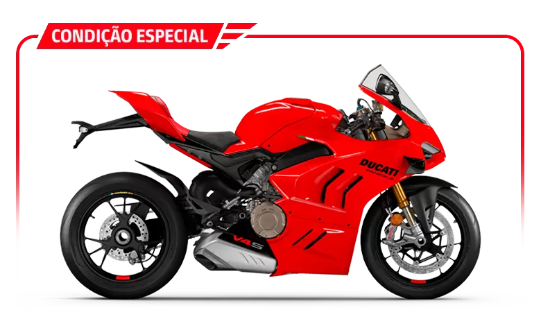 Exclusiva para modelo MY22Streetfighter V4 S MY22. Condição Especial. Ofertas válidas somente para MY 2022, nas Concessionárias Ducati Autorizadas para motocicletas básicas zero-quilômetro. Preços, ofertas e condições de financiamento válidos até 31/12/2025 ou enquanto durarem os estoques. Consulte a disponibilidade na concessionária da sua região. -